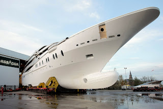 The completed hull was transported to the yard from its nearby hull manufacturer and was joined to her superstructure before being maneuvered into the shed the following day. All technical spaces are painted and ready for the installation of equipment; the acoustic, thermal and fire protection insulation is already in place; and the hull itself is fully sandblasted and sprayed. The yacht is on schedule to continue with her interior and outfitting works for delivery in 2011.