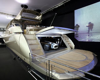 The Predator 108 special edition was unveiled at the Tullett Prebon London International Boat Show 2010 and has been pictured with a Caterham 7 sports car inside the garage at the stern.