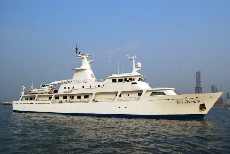 The 64.4m Van Triumph built by Supercraft in Hong Kong during 1984 and was constructed to a high standard and was designed to withstand heavy sea states powered by 2 robust 1400hp Yanmar engines to give a speed of 15 knots. Her fuel capacity of 260,000 litres carried in double bottom tanks gives the yacht a potential range of 15,000 nautical miles if driven at a more sedate 11 knots.