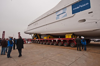 The answer is the hull of an 86 metre SuperYacht as it moves from the builders shed onto a river barge in Holland for transportation to the fitting out facility.