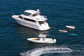 Last but not least is the more diminutive 22m Hatteras Lola B built in 2008. Available in the Bahamas she comfortably accommodates six guests in her three staterooms. She also has a 31′ Contender to access the shallowest waters. Her rates start from US$23,000 per week.