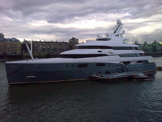 Saw this yacht up close today (September 21st)it’s been docked at the Thames for approx two weeks now and has been drawing attention from everyone crossing Tower Bridge. Up close shes fantastic of course when i say up close i mean from the shore outside the All Bar One i have to say she looks more impressive then the Belfast. Saw some high flyer city slicker board the yacht and make his way through the yacht ooooh to be a modern day Alan Sugar….