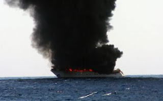 The video eventually shows black smoke becoming flames, which then totally engulf the yacht and burn out the entire accommodation block.