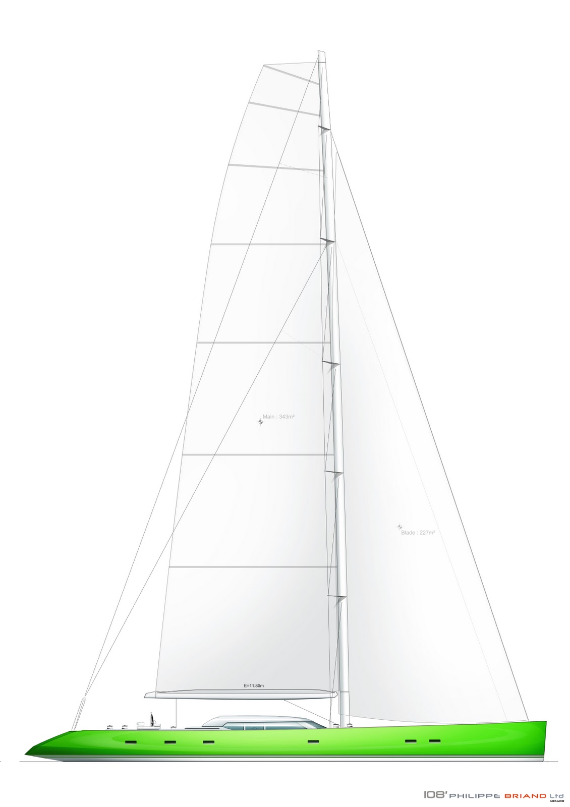 The yacht is based on a high-tech carbon structure. The keel lifts to from a maximum draught of 5.35 m. The high aspect ratio sail plan is directly based on the latest monohulls used for the America’s Cup.