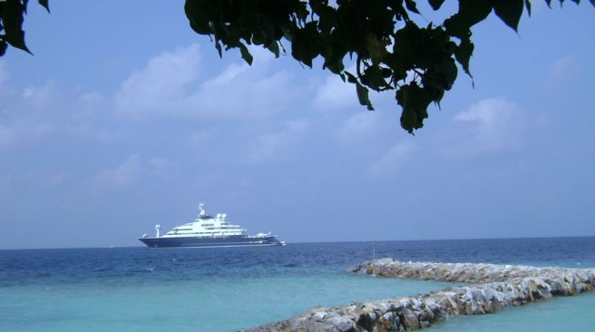 Microsoft co-founder Paul Allen’s luxury yacht “Octopus” anchored outside the Gan island in Addu. Allen arrived at Gan International Airport today. HAVEERU PHOTO/ AHMED ADHSHAN
