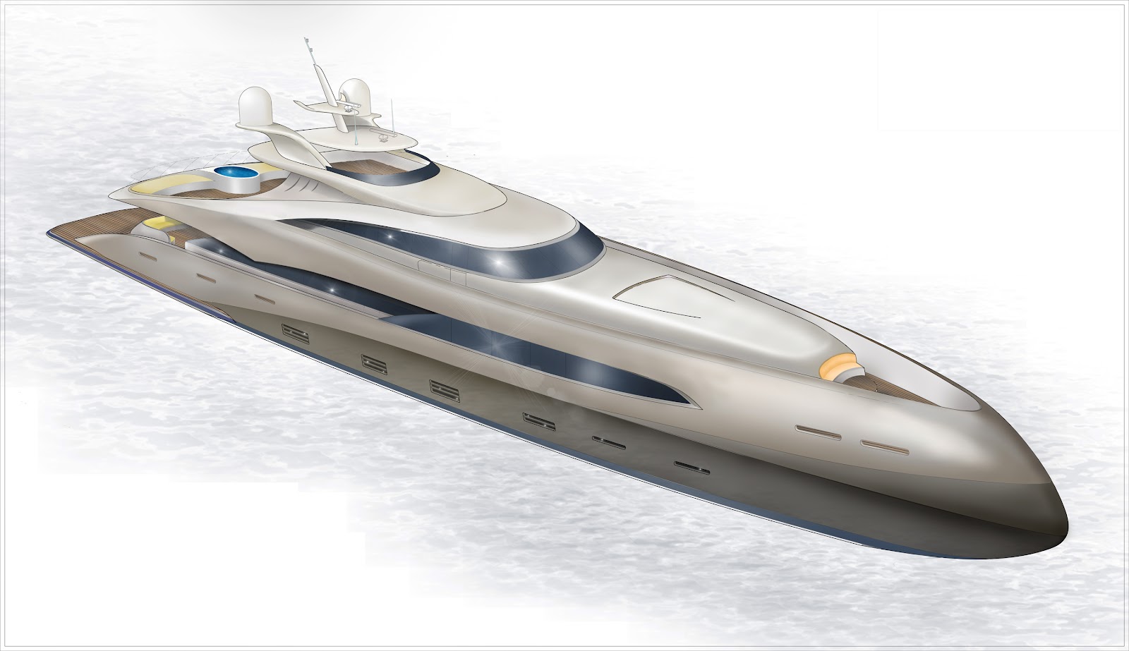 Aft at the lower deck level there are plans for a large, permanent beech club for sunbathing and boarding the yacht’s tender and jet skis, which would be stored in the boat-house with side launching through a hydraulic door, without disturbing the beech club arrangement at all times. The fast RIB lifeboat would be stowed away discretely behind the bow sun deck seating for a quick launch with the hydraulic crane also stowed away alongside the RIB.