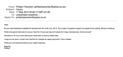 Has anyone else recently received phishing emails purporting to be from a genuine person seeking to charter a yacht?