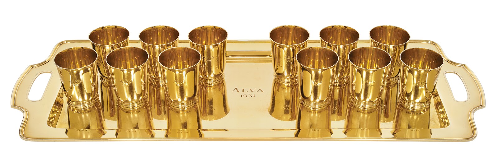It is an 18 kt. gold cocktail tray and twelve 18 kt. gold cordial glasses by Tiffany & Co. The tray and glasses are each engraved “Alva 1931” and the glasses are additionally engraved “Ara 1924.”