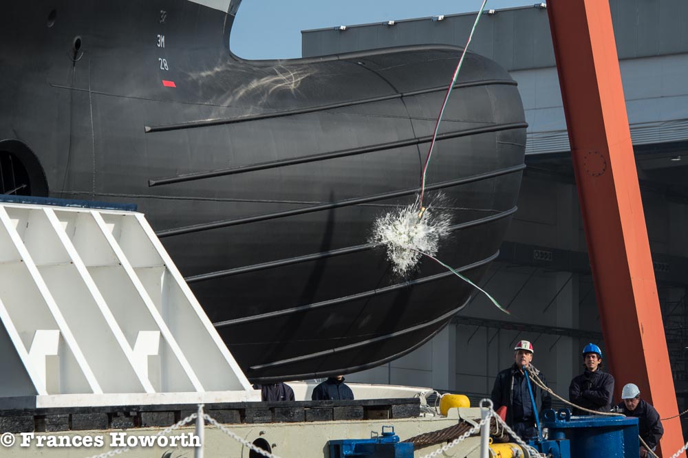But eventually the moment everyone had been waiting for, arrived, the Owner and his family mounted the dais and with a floury crashed the bottle of champagne into the super yachts bulbous bow.Moments later Nessun Dorma, the aria from the final act of Puccini’s Turandot Opera thundered from speakers all over the shipyard as the yacht began to move sedately down the slipway into the sea, and a containerfull of blue helium filled balloons flooded into the skies.