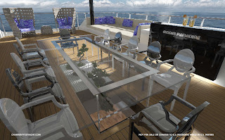 Her extensive panoramic sundeck is complete with Jacuzzi, indoor /outdoor gym, dance floor and exterior TV built in to the bar. Down at sea level guests will find a veritable armada of adrenaline inducing water toys at their disposal including Jet skis, Sea Bobs, wake boards, wake skate to paddle boards, kayaks, towables and a water slide from the upper deck.