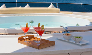 The second great reason to charter the motor yacht Latiko is the fantastic aft deck with a dining table that can seat 10, including comfortable around the wall sofas. The area is cosy yet spacious and has removable walls to protect from any bad weather or wind. There is the possibility of Jacuzzi parties up on the sun deck where there is a bar, stools, and lots of waterproof sunpads, which give excellent panoramic views of the ocean and a sure way to spend a great day or evening with the people closest to you. This area can also be shaded if necessary. This beautiful sundeck is a great third reason to pick Latiko.