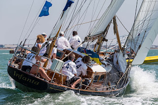 Back ashore the crews are enjoying the Open Yachts Pontoon Party where the sailors get to inspect each other boats while enjoying drinks on the dock. Today the fleet is also celebrating the fiftieth birthday of British Classic Yacht Club Rear Commodore David Orton’s delightful Illingworth and Primrose designed 40 footer St David’s Light, which was built by Souter in 1963.