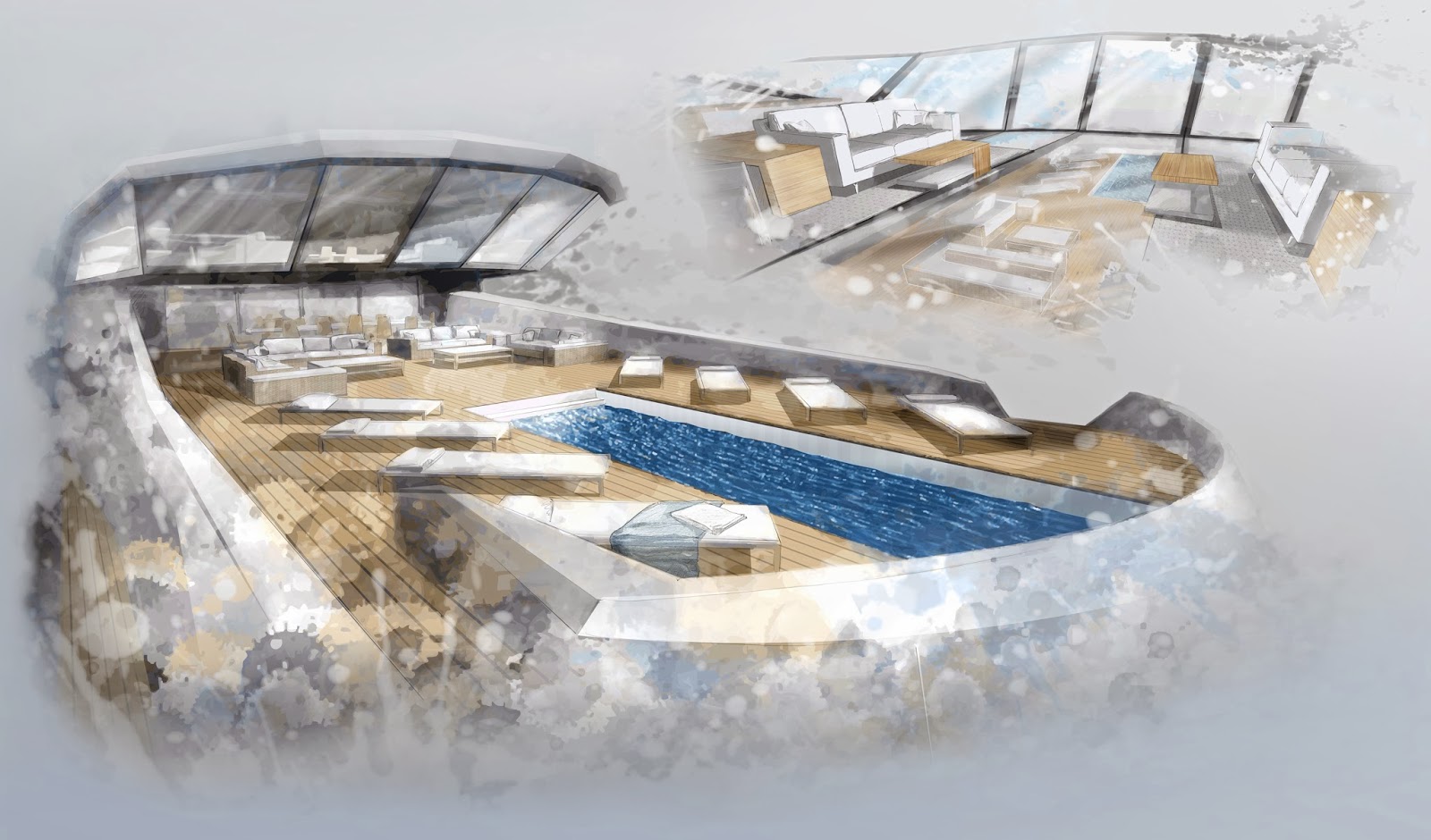 The open space theme is further enhanced by the introduction of a ‘one way’ glass floor to the main saloon, giving a completely uninterrupted view of the pool and sunbathing area below.