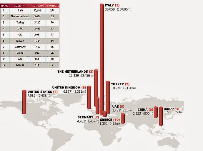 Ranking nations by the aggregate length of their current projects, Italy is still by far the number one yacht-building nation, but The Netherlands and Turkey have consolidated their places. The USA is losing its lead over UK builders, whose tally is up 51 percent in the last two years. Greece clinches the tenth place this year, pushing France out of the list.