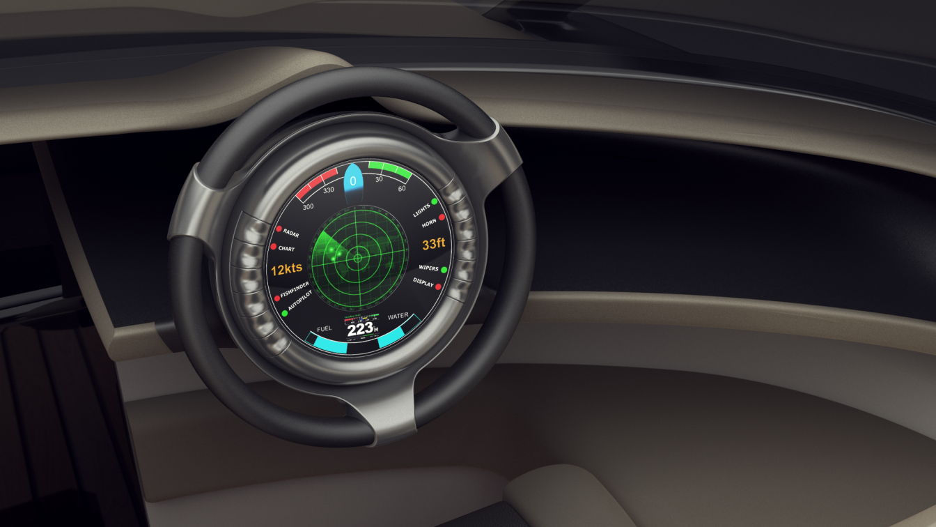 The concept boat showcases an ergonomically optimised interior and includes a Multifunctional Steering Position with paddle throttles and integral LED control display