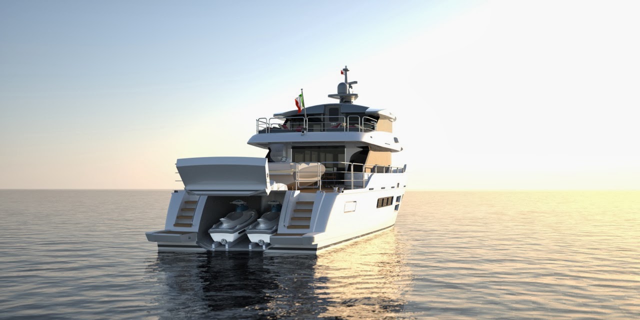 The convertible aft deck, with modular bridge, will stow a 6.50m tender plus a QuadJet while two personal water-crafts will be stored in the transom garage.