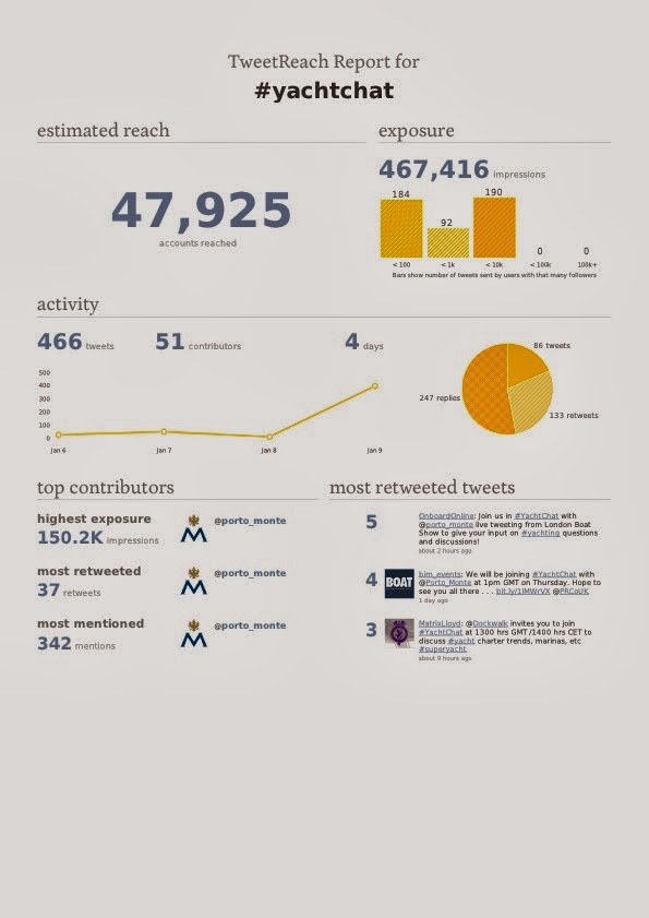 In an hour of tweeting questions to stimulate conversations among the superyacht community 47,925 accounts were reached. 466 tweets from 51 different contributors over the four day exercise generated; 467,416 impressions, 247 replies and 135 retweets.