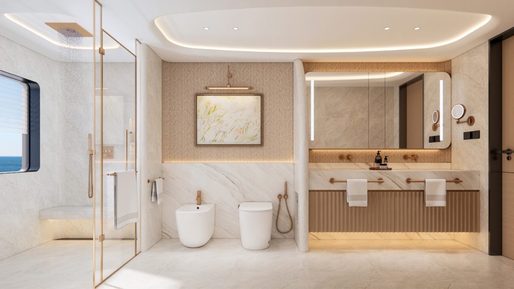 The CLC115 accommodates up to 12 guests in complete comfort. The full-beam owner’s suite occupies prime space on the main deck, featuring a private bathroom, vanity, desk, and double wardrobe.