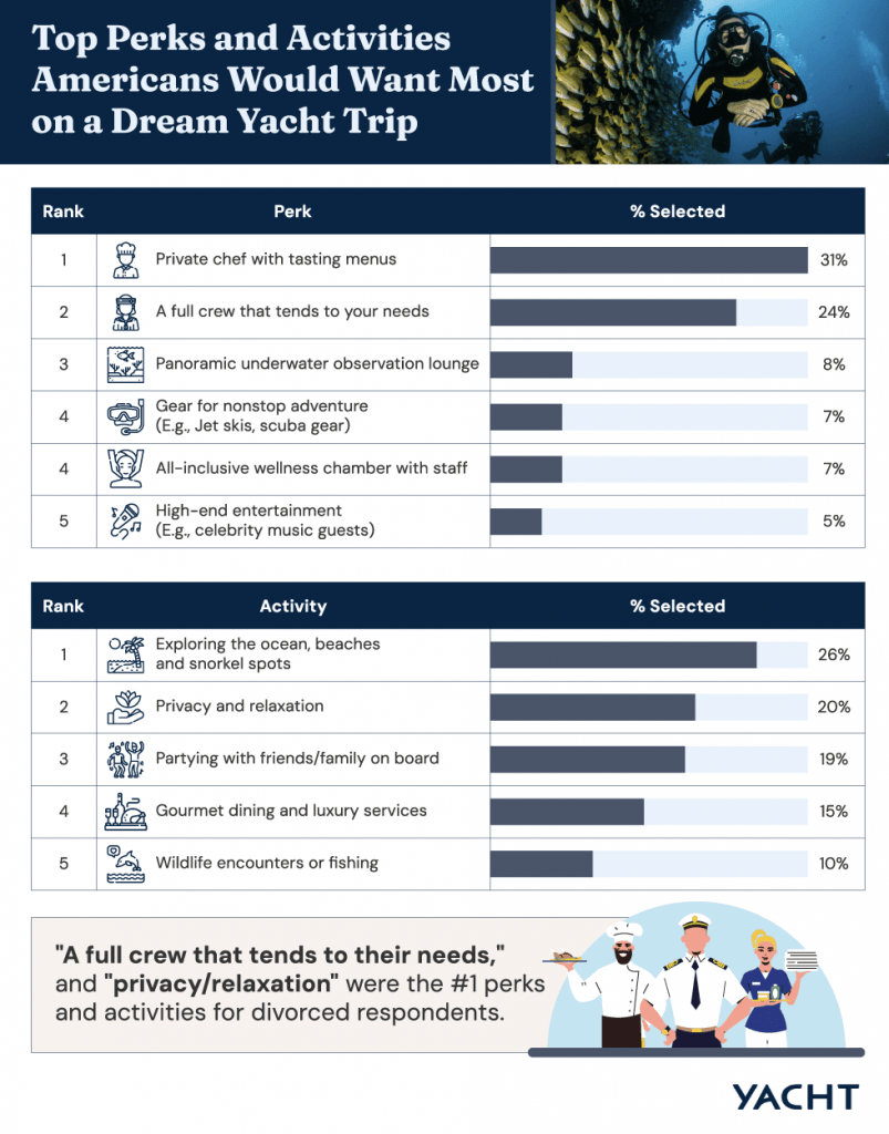 Food and service dominate expectations. 31% want a private chef above all else. Another 24% prioritise a full crew. A panoramic underwater lounge attracts 8% of respondents.