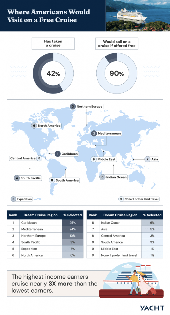 Cruises attract broader experience. 42% of Americans have taken one, compared with only 13% who have been on a yacht. However, 90% would take a free cruise, which is still less than the 94% who would accept a free yacht trip.