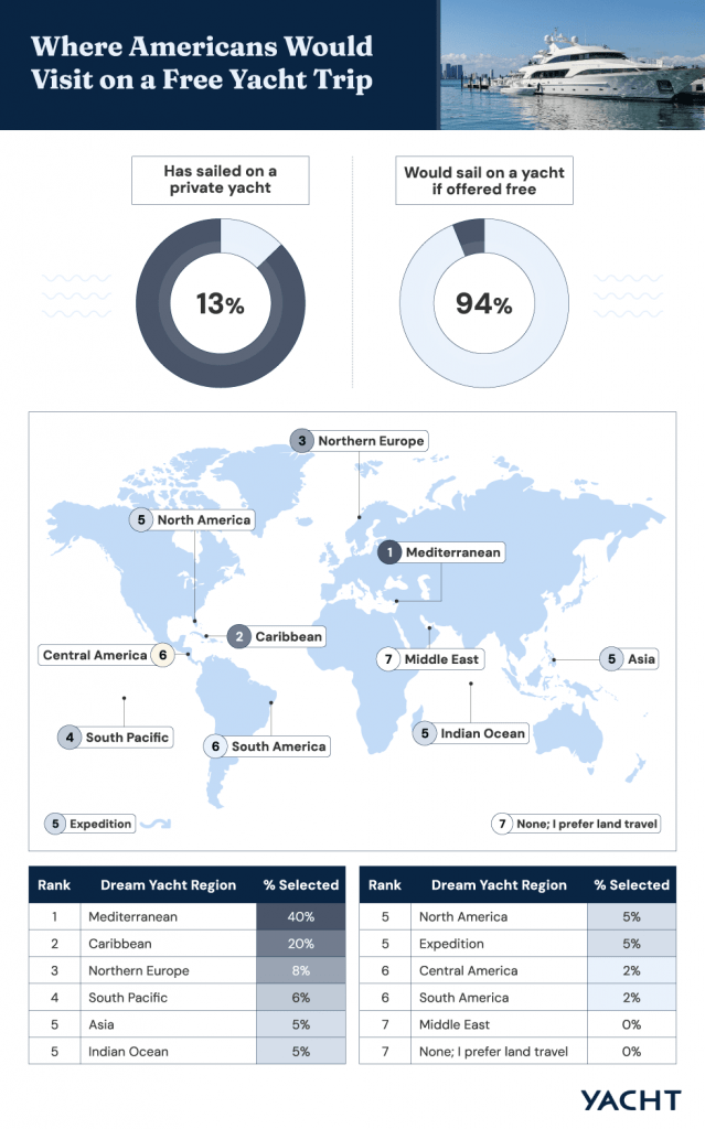 Yacht.com surveyed 1,006 Americans to explore attitudes toward free yacht and cruise trips. Respondents ranged from 18 to 77 years old and represented a wide income spread.